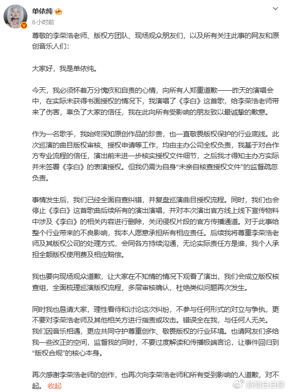3月30日凌晨1点08分,单依纯再次发文道歉。她称此次巡演的曲目版权审核、授权申请等工作,均由主办公司全权负责,自己演出前未进一步核实授权文件细节,之后才得知主办方实际并未签署《李白》的表演授权。“但我仍需为自身‘未亲自核查授权文件’的监督疏忽负责。”