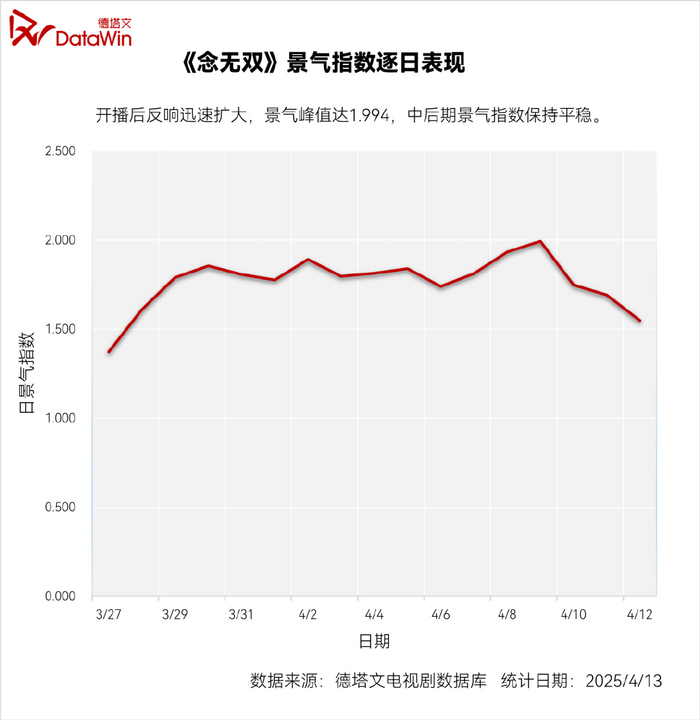 在视觉感受和价值传达上实现仙侠剧突破与创新的《念无双》正式播出后,德塔文景气指数上升迅速,伴随“自来水们”的口碑发酵,中后期景气指数表现稳健。目前,在爱奇艺、优酷双平台热度均已突破7000,稳居当前古装剧市场头部位置。