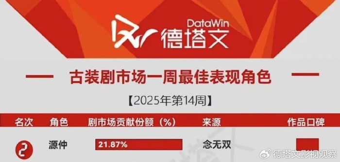 其中,凭借角色魅力和演技优势,刘学义扮演的男主角源仲,成为剧集核心看点之一。平均角色贡献度达到39%,是为剧集引流的重要推动力。此外,源仲还以21.87%的占比,摘得德塔文古装剧市场一周最佳表现角色TOP2。