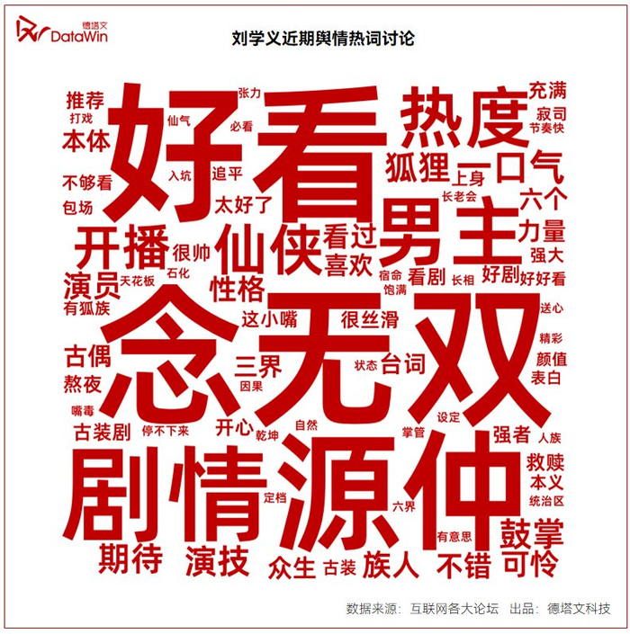 舆情热词方面,“源仲”、“念无双”、“好看”、“喜欢”、“台词”和颜值、演技塑造等正面舆情热词高密度聚合,亦是刘学义依靠外形气质和演员口碑,收获观众认可的又一佐证。