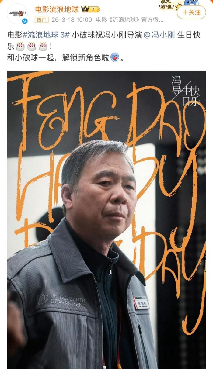 3月18日,国产科幻巨制《流浪地球3》迎来了一位重磅新成员。当天恰逢著名导演冯小刚68岁生日,电影官方微博“小破球”特意卡点送上祝福,并投下一枚重磅“彩蛋”:正式官宣冯小刚加盟《流浪地球3》 。