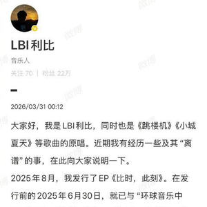3月31日凌晨,音乐人利比发布长文,分享近期与“环球音乐中国”的纠纷。他自行总结了三点内容,具体如下: