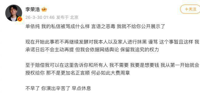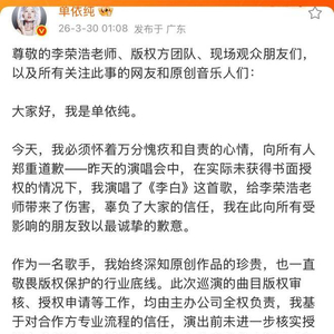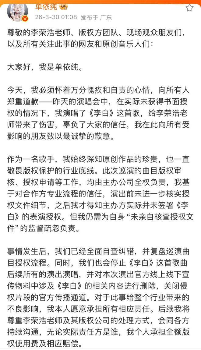 极目新闻记者 付瞰报道,3月30日凌晨,单依纯在深圳演唱会落幕后,针对被李荣浩指责强行侵权一事,发布了长文再次道歉,承认在未获书面授权的情况下演唱了李荣浩的作品《李白》。 单依纯在声明中提到,虽然巡演曲目的版权审核与授权申请工作是由演唱会主办方全权负责,但她仍需为自身未亲自核查授权文件的监督疏忽承担责任。此外,她明确表示,不论实际责任方是谁,我个人将承担全额版权使用费及相应赔偿。发布声明38分钟后,李荣浩在社交平台回应称,他并不需要单依纯赔偿:如果我想要钱,从一开始就会直接授权给你,那不是更名正言顺吗?何必大费周章。
