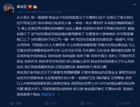 李荣浩发“小作文”怒怼自家物业 粉丝:加标点!_微博