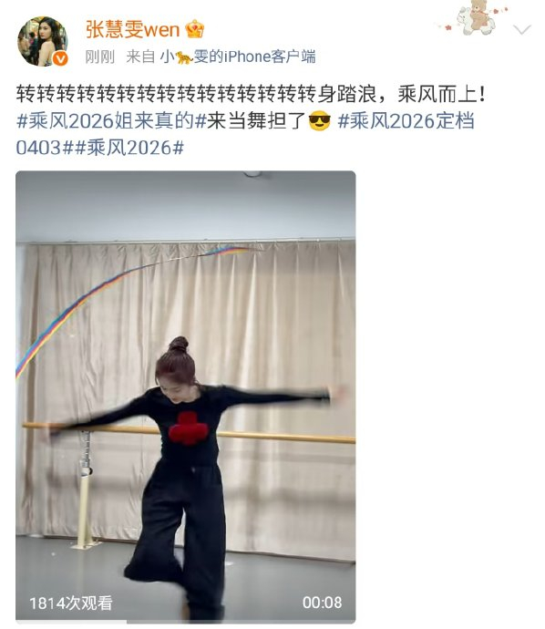 张慧雯在节目官宣时手持北舞毕业证书,以连续旋转15圈的高难度动作(好友娜扎调侃数出18圈)高调宣示“舞担”身份。这段视频单日播放量破千万,被网友评价为“北舞实力天花板”“野心与实力并存”。其舒展的身段、稳定的核心力量,让观众提前预见了她在舞蹈领域的统治力。