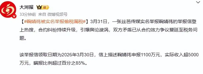 2026年3月30日,上海税务局稽查局接到实名举报,一切的舆论都指向丝芭传媒公司,说他们举报的对象竟然是自家顶流鞠婧祎。