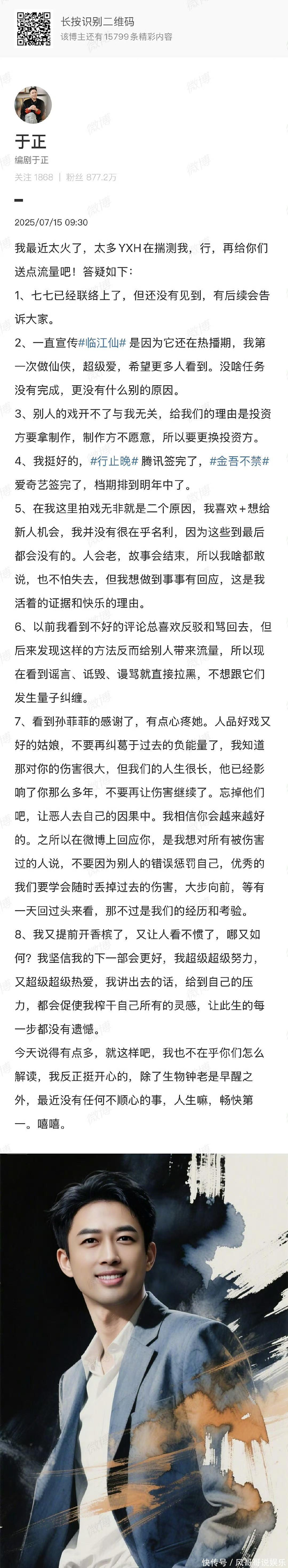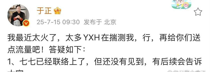 联络确认:于正与七七(希夕)联系进展及家庭态度于正公开回应微博发文:2025年7月15日,知名编剧、制片人于正在其个人微博上发布了一则消息,明确表示他已经与七七(本名希夕)取得了联系,但截至目前双方尚未见面。于正承诺会持续跟进,并及时向公众公布后续的进展情况。