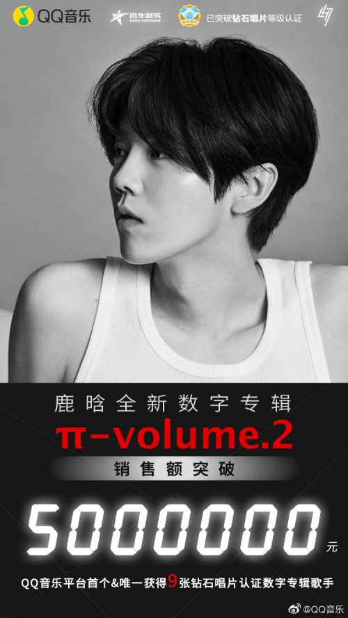 鹿晗凭《π-volume.2》第9次认证钻石唱片 音乐娱乐见证突破