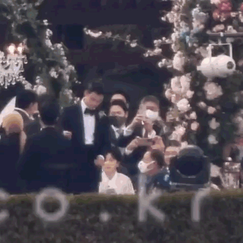 宾客们都戴着口罩,很难分辨谁是谁。不过名单已经在网上曝光了。为新人送上祝歌的是韩国ost女王Gummy,知名歌手金范秀和Paul Kim。
