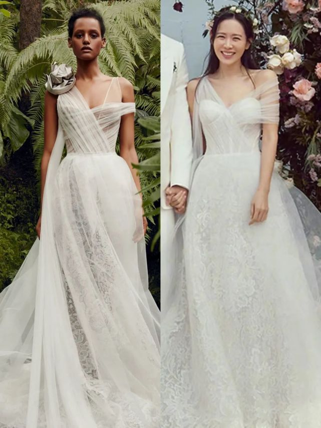 蕾丝白纱款来自Vera Wang,价值人民币6万多。孙艺珍去掉了原本左肩上的银色花朵,让整体造型更加轻盈婉约。
