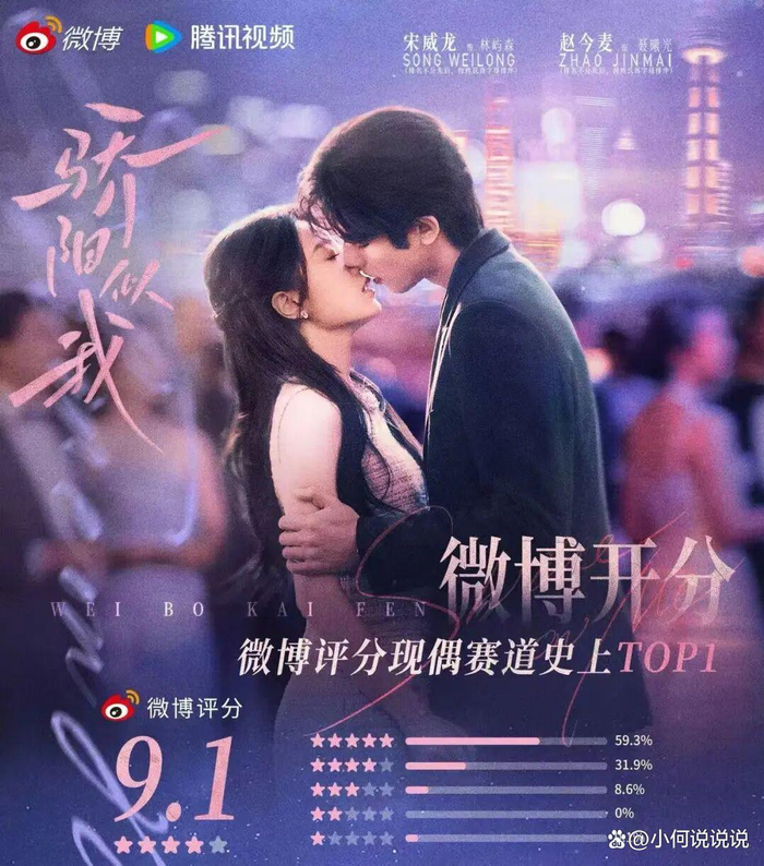 更难得的是,《骄阳似我》的站外热度与口碑也非常亮眼:多次在猫眼、德塔文、骨朵等第三方榜单登顶,剧集主话题微博阅读量超28.8亿,抖音播放量超151.8亿;豆瓣开分7.4,成为2025年国产现代爱情剧最高分;以9.1的高分成为2025微博剧集评分榜TOP3,也是评分前十的剧集中,唯一一部现偶。