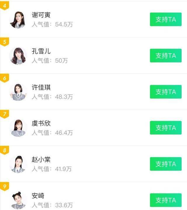 其余成员截止日前的微博粉丝数量按照排名依次为:刘雨昕(414w)、谢可寅(320w)、孔雪儿(318w)、安崎(262w)、赵小棠(214w)、喻言(204w)、陆柯燃(169w)。我们可以看到刘雨昕虽然在节目中票数断层C位出道,但是微博粉丝数量依然与虞书欣和许佳琪有很大的差距,这无疑是节目之前的作品没有很好的热度所导致的,很开心宝藏女孩这次终于被大家发现啦。同样,安崎通过节目从原先的24个粉丝成功破百万,也是很令人惊喜的。
