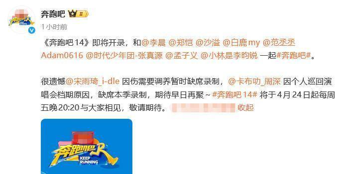 《奔跑吧》第14季已定档4月24日起每周五晚在浙江卫视播出。 官方在公告中对宋雨琦和周深的表述略有不同:宋雨琦是“因伤需要调养暂时缺席录制”,周深则是“因个人巡回演唱会档期原因,缺席本季录制”。 对于宋雨琦,官方留下了“期待早日再聚”的寄语,对于周深,则表达了“期待再聚”的善意。
