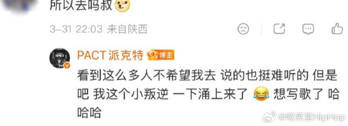 “看到这么多人不希望我去 说的也挺难听的 但是吧 我这个小叛逆 一下涌上来了 😂 想写歌了 哈哈哈”