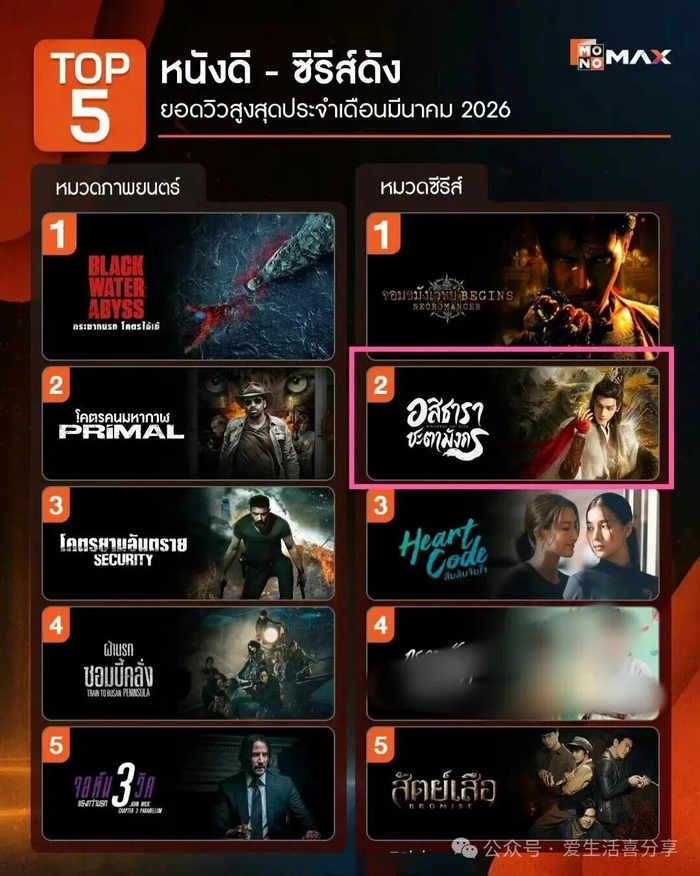 2026年3月,泰国主流视频平台MONOMAX热门剧集榜正式出炉,罗云熙主演的东方玄侠剧《水龙吟》强势拿下榜单第二,以收官数月仍稳居前列的亮眼成绩,再次印证其在泰国市场的《水龙吟》惊人的长尾效应!