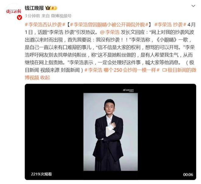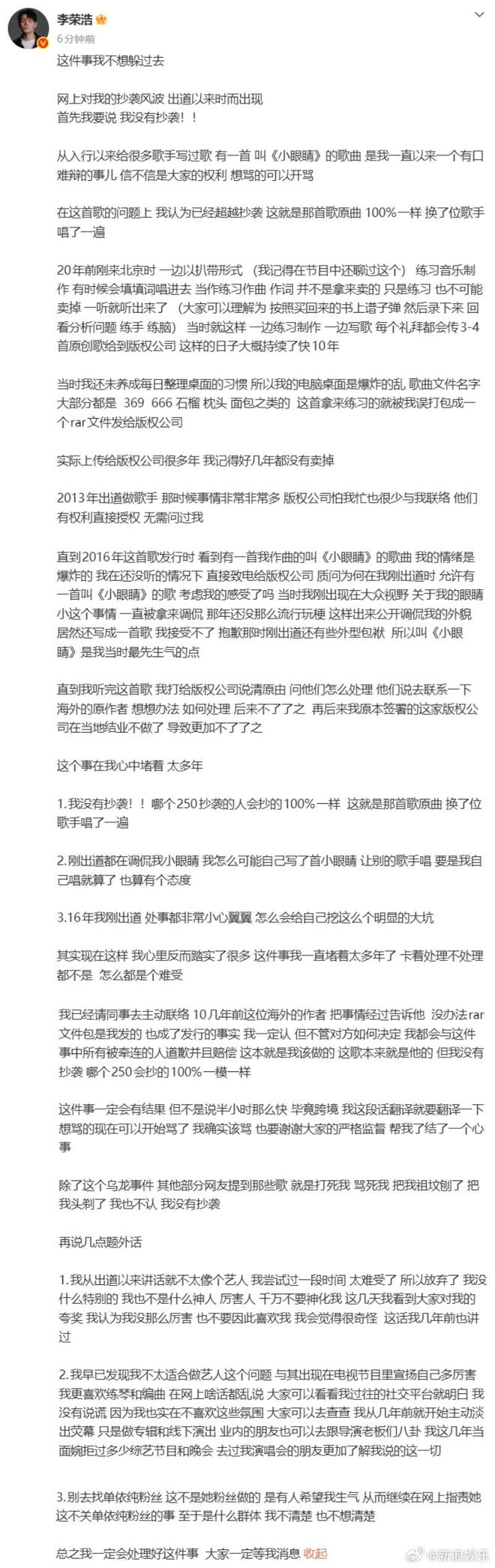 李荣浩发长文否认抄袭:首先我要说,我没有抄袭!