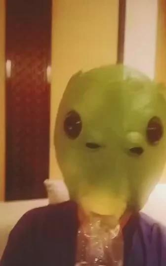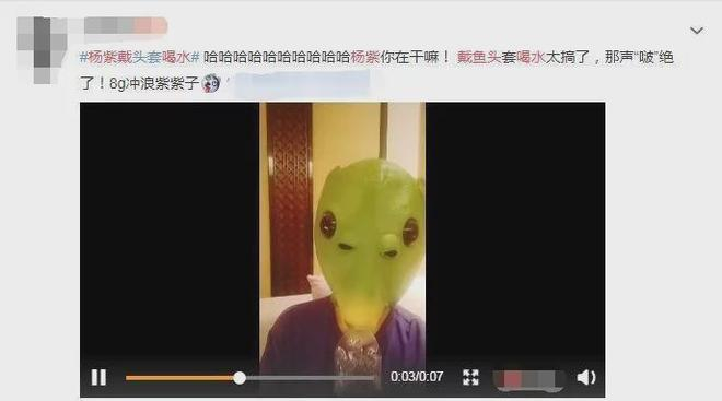 杨紫这次是分享一个戴着头套喝水的视频。视频中杨紫穿着紫色的T恤,戴着一个塑胶质感的鱼头,看着非常怪异又极其诙谐。杨紫又打开了一瓶水,把这瓶水对准鱼口灌进去,喝完了之后杨紫又把瓶子拿出来。或许是因为头套很紧的原因,所以鱼嘴发出了“啵”的一声。