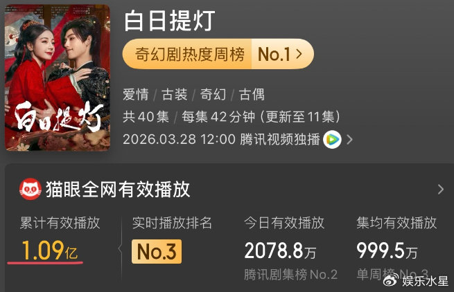 据猫眼专业版、灯塔专业版等权威数据平台统计,由迪丽热巴、陈飞宇领衔主演的古装奇幻网剧《白日提灯》,全网累计正片有效播放量正式突破1亿大关。