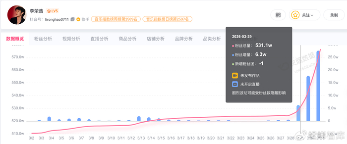 第三方平台数据显示,李荣浩近3日涨粉近50万。
