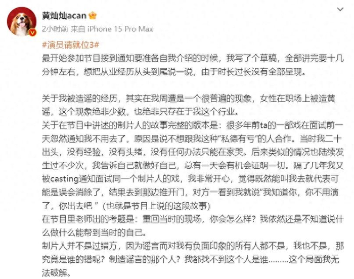 2025年2月22日,演员黄灿灿因在综艺《演员请就位3》中自曝“因被造黄谣失去工作机会”引发热议,相关话题迅速登顶热搜榜首。当晚,她在个人社交平台发布长文,以冷静克制的笔触回溯被谣言裹挟的五年,直言“制片人并非过错方”,并呼吁公众关注女性职场困境