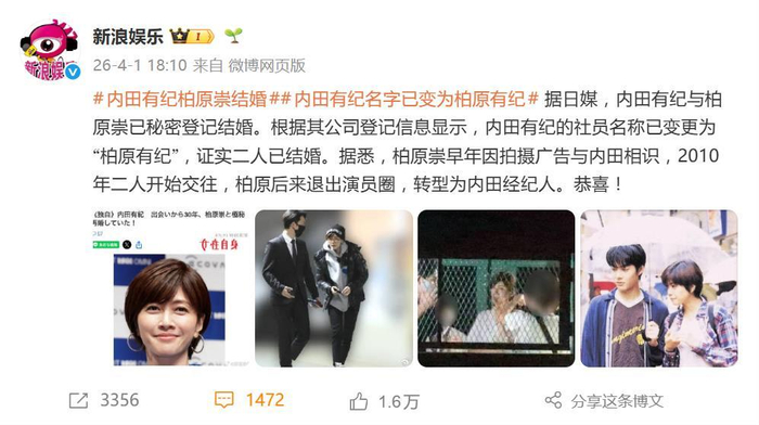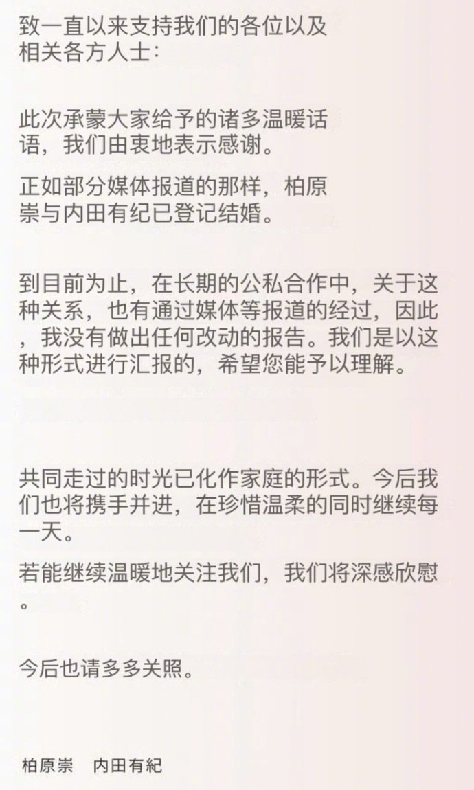 这则婚讯的曝光方式,堪称“被动式官宣”。除了官网声明,另一关键证据是公司登记信息——内田有纪的社员名称已悄然变更为“柏原有纪”。当媒体向双方事务所求证时,得到的仅是“私人事务不予置评”的标准回复。据悉,多数工作伙伴也并未提前知情,婚讯完全以非公开形式处理。