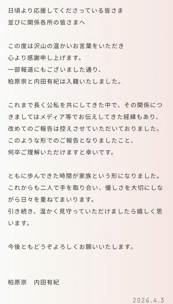 在声明中,内田有纪将两人共同走过的时光,形容为如今化作了“家人”这一形式。她明确表示,双方关系早已通过媒体被公众所知,因此此前并未特意主动公布婚讯。未来,两人将携手共进,珍惜彼此的温柔,认真度过每一天,并恳请外界能以温暖的方式守护他们。
