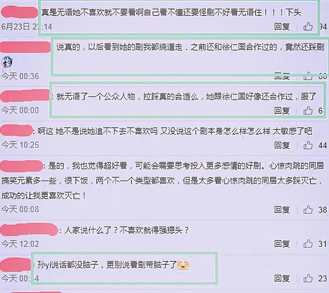 孙怡说不喜欢《灭亡走进我家门》,就有人开始喷她,说“自己不喜欢不说就好了,这是什么意思,她是一个公众人物,说的话都会影响别人的判断”。
