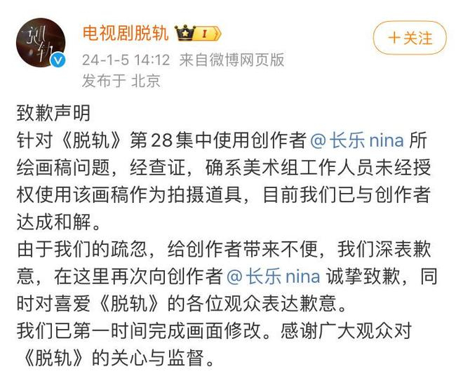致歉声明中表示,“针对《脱轨》第28集中使用创作者@长乐nina 所绘画稿问题,经查证,确系美术组工作人员未经授权使用该画稿作为拍摄道具,目前我们已与创作者达成和解。”声明中还表示,对于剧方的疏忽,给创作者带来不便深表歉意,“在这里再次向创作者@长乐nina 诚挚致歉,同时对喜爱《脱轨》的各位观众表达歉意。我们已第一时间完成画面修改。感谢广大观众对《脱轨》的关心与监督。”