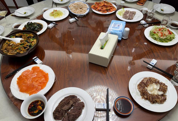 仅仅二十天后,2026年2月16日,除夕夜。 黄晓明的社交账号更新了,定位海南三亚。 他晒出了一桌丰盛的年夜饭,整整十道菜。 卤牛肉、凉拌木耳、三文鱼刺身、白灼虾、菌菇炖肉,冷热荤素搭配讲究,摆盘精致得像星级酒店。 照片里没有厨房的烟火气,这顿饭是在外面的餐厅吃的。 黄晓明配了一段文字,他说今年的春节有点特别,和爸妈一起吃年夜饭,还偶遇了北京电影学院的恩师,崔老师和霍老师。 两家人凑成了一桌,他说这是和两位爸爸、两位妈妈一起过除夕,幸福加倍。