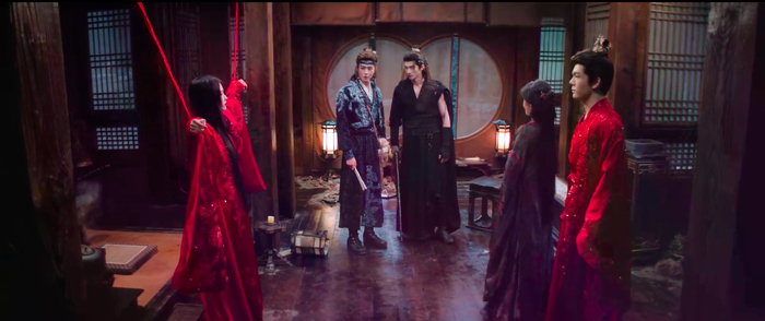 假新郎遇到假新娘,一番厮杀,不分胜负,从室内打到屋顶,被刚赶到韦府的厉劫与寄灵撞见。