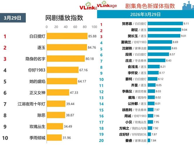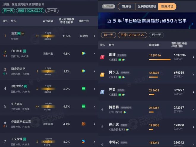 最精彩的对决莫过于《白日提灯》与《逐玉》的榜首之争:一边是《白日提灯》开播次日便以85.88的播放指数强势反超,登顶Vlinkage剧集榜榜首,贺思慕更以9.11的角色指数断层登顶;另一边,《逐玉》却稳坐云合全网正片播放量第一,市占率高达41.5%,谢征、樊长玉、齐旻三角色仍旧占据霸屏角色榜前三。