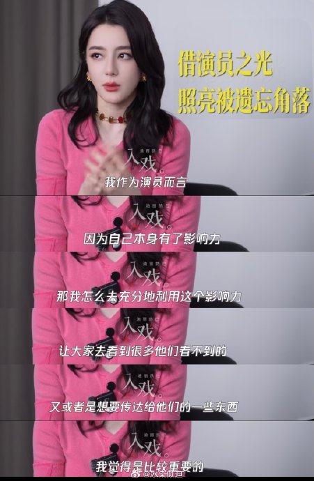 迪丽热巴多次强调演员不仅是职业身份,更是社会责任的载体。她认为演员需"利用影响力让观众看到他们看不到的角落",例如在《利剑玫瑰》中饰演打拐警察,旨在唤起公众对拐卖问题的警觉。2026年4月受访时,她更直言"流量不是缥缈数字,而是灌溉社会的活水",主张将关注度转化为对现实议题的推动力。