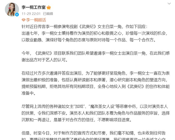 该剧阵容如此引人注目,主要是此前李一桐辞职事件。 11月29日,李一桐工作室突然宣布辞去《武庚纪》女主白菜一角。 主要原因是对制作方的宣传方式和节奏一无所知,没有收到任何告知。 表明事情已经发酵,脱离了最初合作的美好愿景。