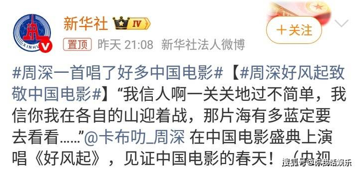 周深工作室发文,好评歌手周深在中国电影盛典演唱《好风起》的精彩表现!周深发文!用歌声和光影对话,是特别奇妙的体验!周深演唱《好风起》,有感而发!因此,歌手周深的全新境界,正在得到提升!2026年,是马年,也是希望的一年!认真把握机会,不断努力地人,才能遇见更好的自己!
