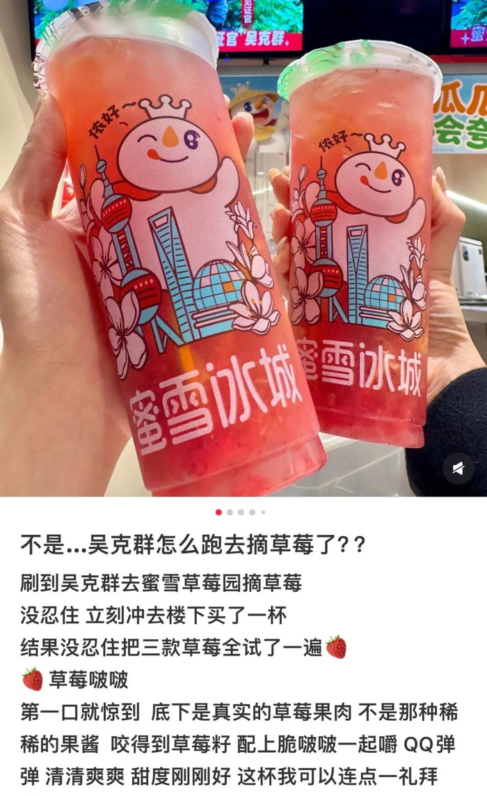 第二,邀请吴克群当“蜜雪冰城助农伙伴和真果茶见证官”。