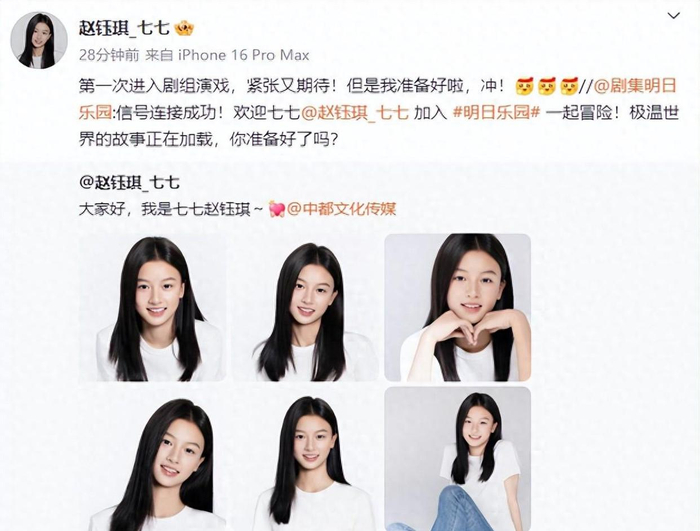 1月5日,去年因颜值爆火的15岁素人女孩赵钰琪“七七”,正式签约了中都文化传媒,还官宣自己进组了由钟楚曦、尹昉、敖子逸主演的《明日乐园》。