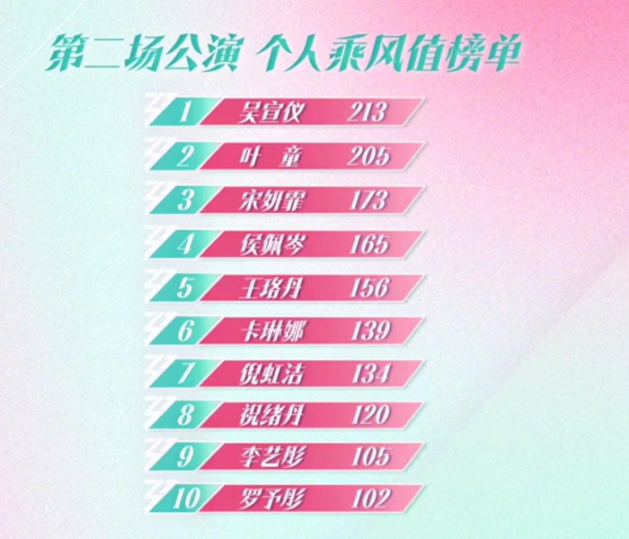 吴宣仪凭借213个乘风值拿到了人气第一名,线下拼粉丝对于女团选手来说小菜一碟,她的人气也足以撑得起这样的排名。