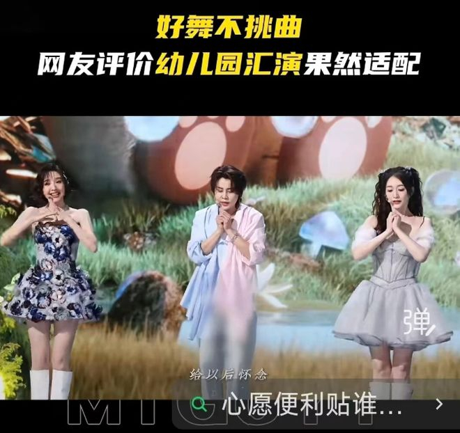 作为队长的李小冉,全程跑调、高音失控,看得出来确实是没有唱歌的好基因了。唐艺昕也没好到哪里去,高音破音,还中途忘词,只能靠着甜美的笑容救场。三个人各唱各的,节奏混乱,舞蹈也很生涩,凑在一起满是“幼儿园文艺汇演”的既视感。