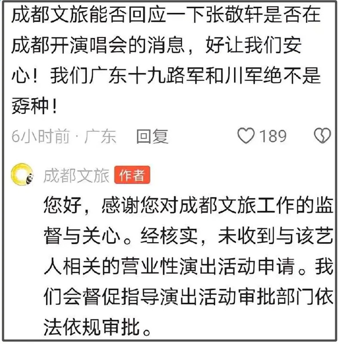 张敬轩要来内地开演唱会的传闻愈演愈烈,不少网友都跑到成都文旅社媒评论区留言抵制,成都文旅紧急回复,否认张敬轩成都演唱会过审。同时,支持张敬轩在内地复出的霍汶希,和相关组织评论区也迅速沦陷,宗旨就一句话,抵制劣迹艺人在内地复出!