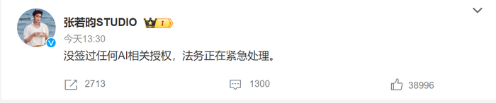 张若昀工作室发微博回应:“没签过任何AI相关授权,法务正在紧急处理。 "