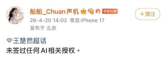 王楚然官方后援会的账号“船船_Chuan声机”在王楚然超话发布信息:“未签过任何AI相关授权。”