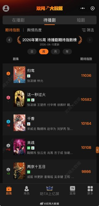 - 待播剧热度榜单中,《归鸾》持续位列前三,平台方可能为争取最佳宣发窗口而精细排期。