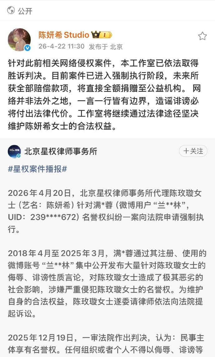 真正让网友们拍手叫好的,是陈妍希工作室发布的声明。工作室表示,针对此前相关网络侵权案件,已经依法取得胜诉判决,目前案件进入强制执行阶段。最关键的一句话:“未来所获全部赔偿款项,将直接全额捐赠至公益机构。”