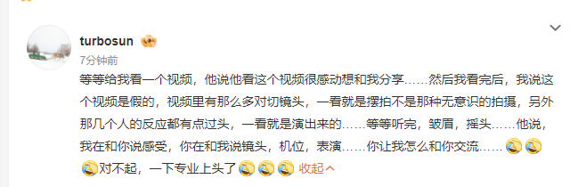 等等给我看一个视频,他说他看这个视频很感动想和我分享……然后我看完后,我说这个视频是假的,视频里有那么多对切镜头,一看就是摆拍不是那种无意识的拍摄,另外那几个人的反应都有点过头,一看就是演出来的……等等听完,皱眉,摇头……他说,我在和你说感受,你在和我说镜头,机位,表演……你让我怎么和你交流……对不起,一下专业上头了”。