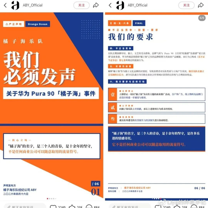 你敢信?华为刚发了个新配色“橘子海”,结果被一支乐队给告了。