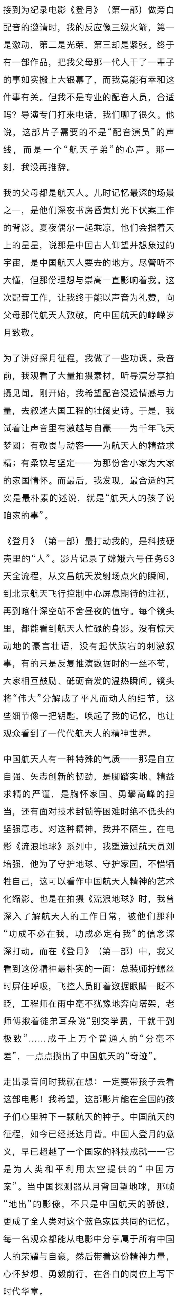 “这次配音工作,让我终于能以声音为礼赞,向父母那代航天人致敬,向中国航天的峥嵘岁月致敬。”他写道。