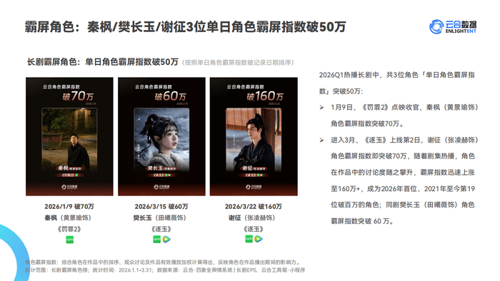 角色影响力方面,《逐玉》男主角谢征(张凌赫饰)单日角色霸屏指数突破160万,成为2026年首位、2021年至今第19位破百万的角色;同剧女主角樊长玉(田曦薇饰)也突破60万。此外,《羽罪2》中的秦枫(黄景瑜饰)在点映收官日霸屏指数突破70万。这些数据反映出优质剧集对演员热度的强拉动效应。