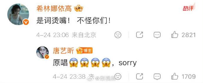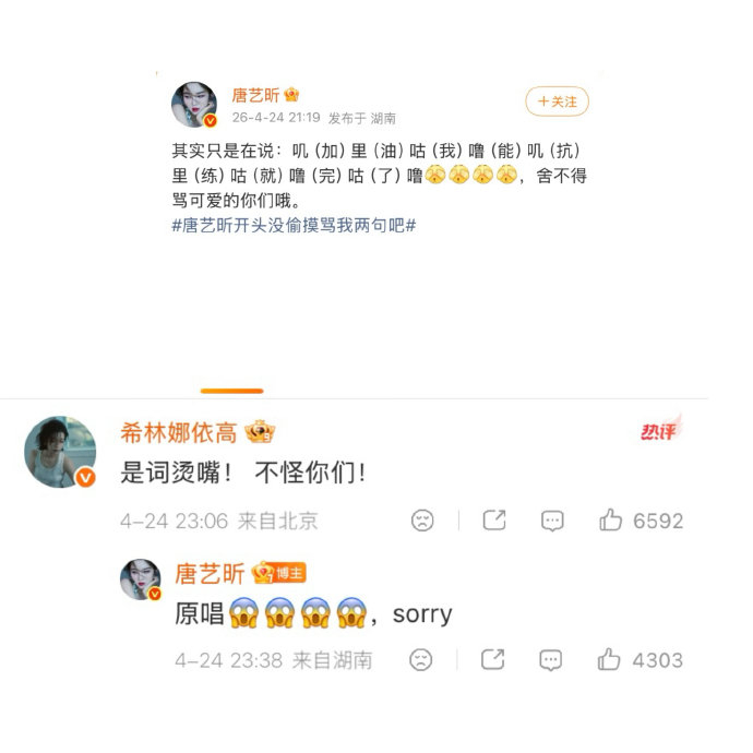 面对舆论发酵,唐艺昕于4月24日率先发博,用谐音梗巧妙化解:“其实只是在说:叽(加)里(油)咕(我)噜(能)叽(抗)里(练)咕(就)噜(完)咕(了)噜”。原唱希林娜依高随即现身评论区力挺:“是词烫嘴!不怪你们!”唐艺昕幽默回应:“原唱,sorry。”两人一来一往的互动被赞“可爱又大气”。网友提炼出核心评价关键词: