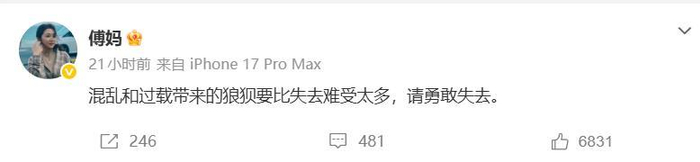 当天,傅首尔在社交平台写下:“混乱和过载带来的狼狈要比失去难受太多,请勇敢失去。”短短一句话,迅速点燃网友敏感神经。结合她2023年与丈夫老刘的离婚经历,评论区的解读方向几乎一边倒:有猜测她遭遇新恋情挫折的,有推断她情绪陷入低谷的。
