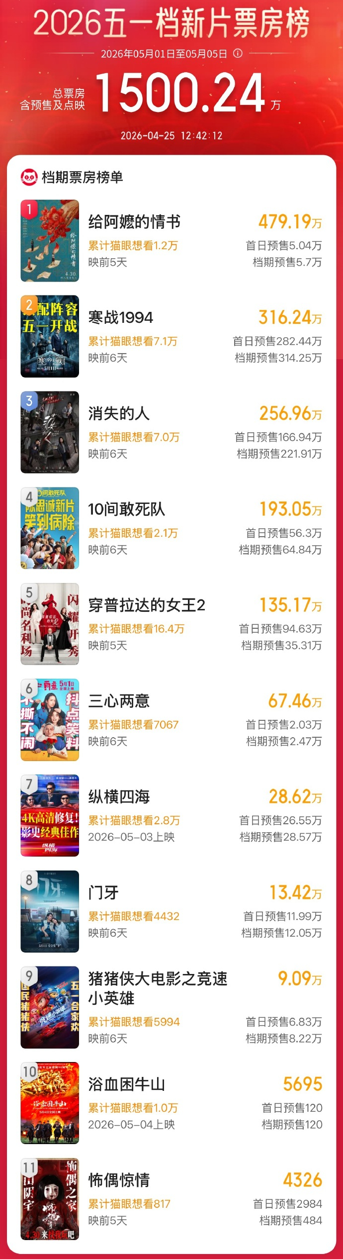 2026五一档新片预售票房破1500万 澎湃新闻 澎湃新闻官方账号 04.2515:25 关注 据网络平台数据,2026年五一档新片预售票房突破1500万,《给阿嬷的情书》《寒战1994》《消失的人》分列前三位。